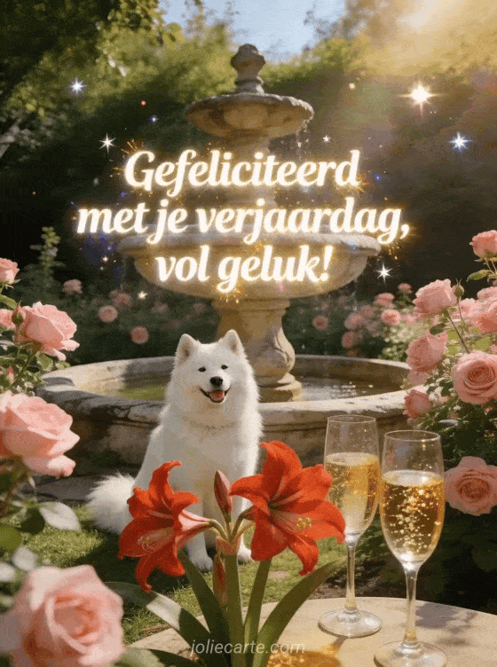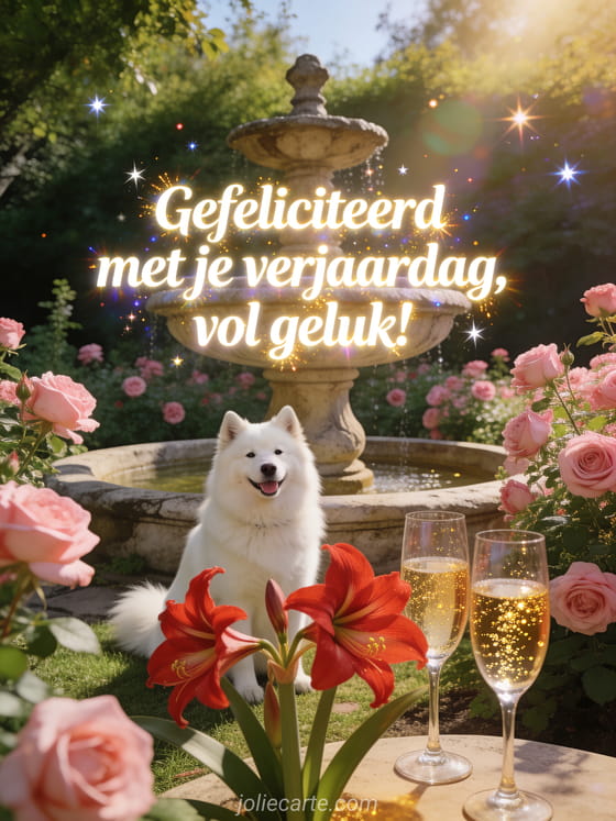 Vier met een stralende verjaardagskaart met lachende witte samojeed, oude fontein, verse rozen, rode amaryllis en sprankelende champagneglazen. Bekijk ook we wensen je een fijne verjaardag, gefeliciteerd met je verjaardag schattige kat en gefeliciteerd met je verjaardag gif gratis.