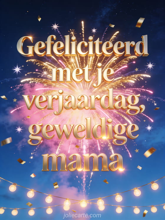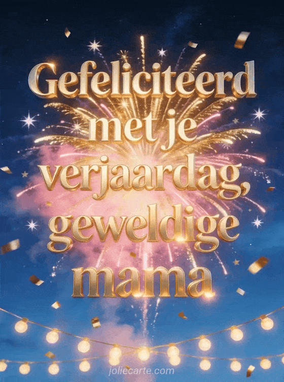 Vier een geweldige mama met warme gouden letters, een spectaculaire uitbarsting van goud en roze vuurwerk in een diepblauwe nachtelijke hemel, fonkelende sterren, vallende gouden confetti en lichtgevende slingers. Stuur ook een geanimeerde gefeliciteerd met je verjaardag mama, een gefeliciteerd met je verjaardag mama kaart of een gefeliciteerd met je verjaardag kaart voor een jonge mama.