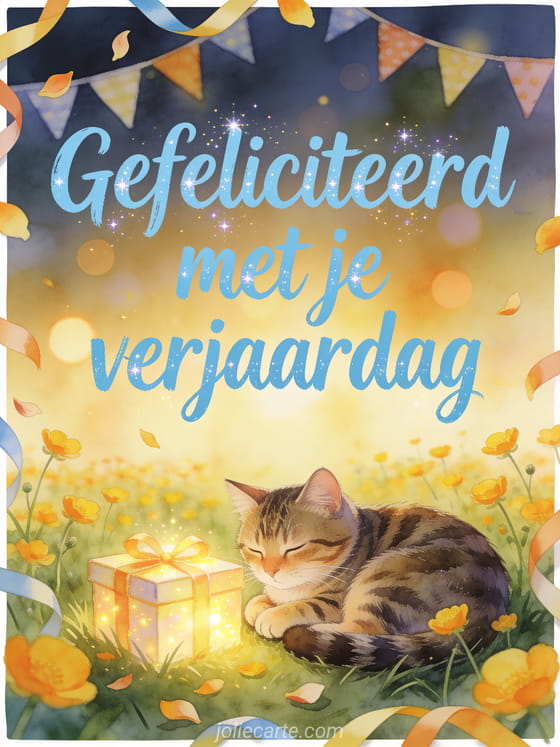 Stuur je kleindochter een lieve kaart met een tijgerkat die naast een lichtgevende cadeaudoos in een vrolijke weide met boterbloemen ligt. Misschien vind je ook een verjaardag voor mijn kleindochter kaart of een fijne verjaardag kleindochter afbeelding mooi om haar dag te vieren.