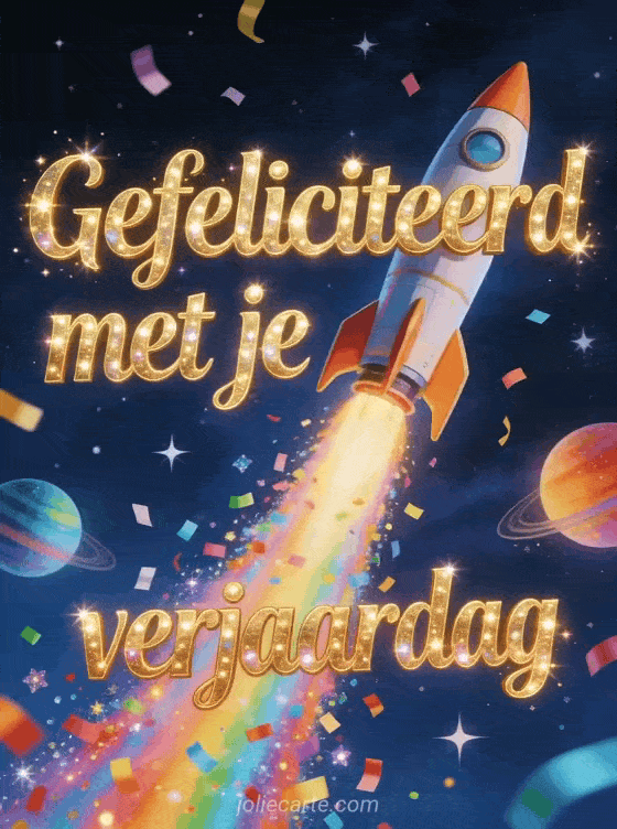 Deel een energieke verjaardagskaart met een kleurrijke raket die opstijgt in een diepe nachthemel en een spoor van confetti en glitter achterlaat tussen planeten en sterren. Bekijk ook een gefeliciteerd met je verjaardag jongen gif, een fijne verjaardag mijn lieve zoon of een bericht fijne verjaardag zoon.