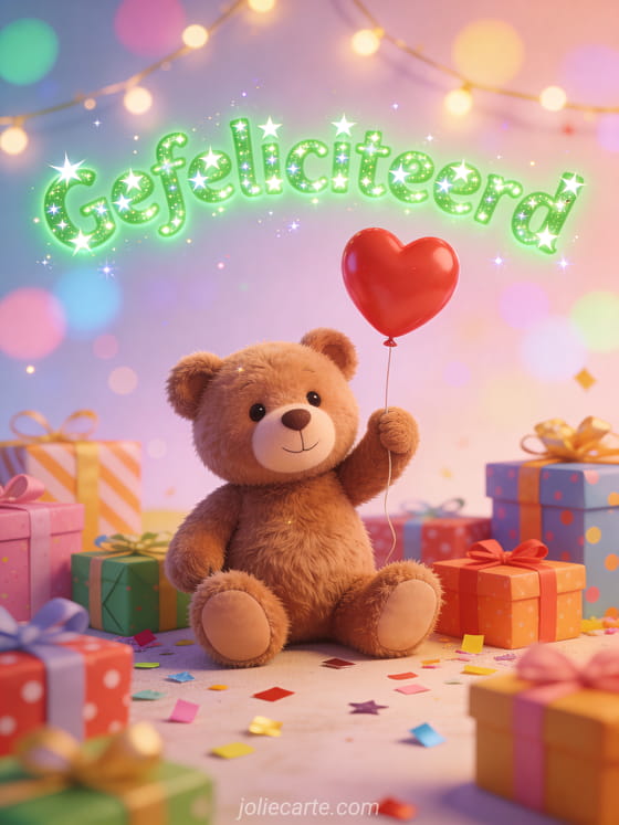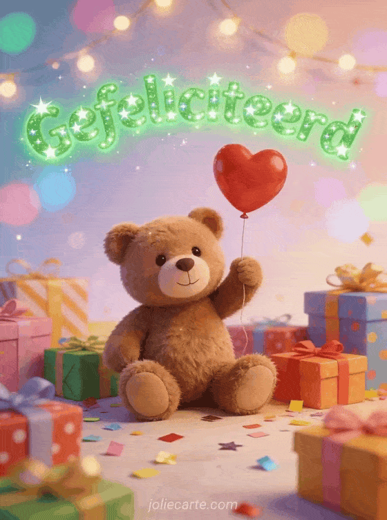Deel een lieve verjaardagskaart met een klein bruin beertje dat een rode hartballon vasthoudt, omringd door kleurrijke cadeaus, confetti en lichtslingers op een pastelkleurige bokeh-achtergrond. Je kunt ook een verjaardagskaart voor een broer, een broertje gefeliciteerd met je verjaardag mijn broer gif of een gefeliciteerd met je verjaardag kleine broer gif kaart sturen.