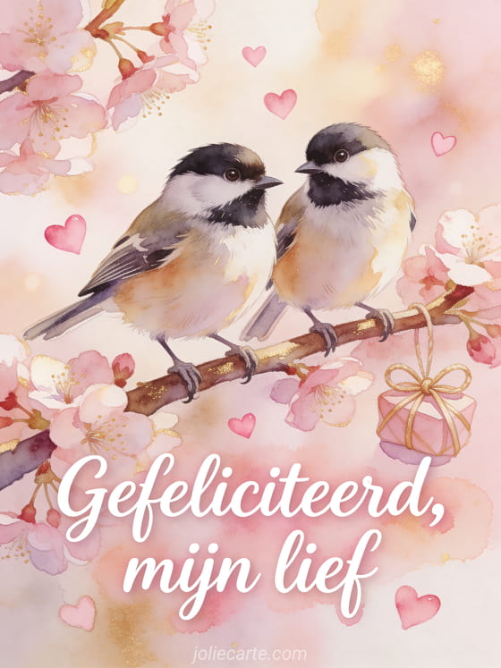 Stuur een romantische verjaardagsgroet met een delicaat aquarelpaar mezen op een bloeiende kersenboomtak. Roze harten, een cadeaustrik en zachte lentekleuren maken deze kaart teder en feestelijk. Ontdek ook een verjaardagsafbeelding voor mijn lief, een romantische verjaardagskaart afbeelding of romantische verjaardagskaarten.