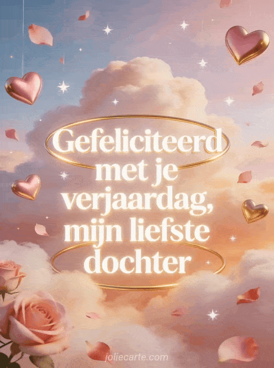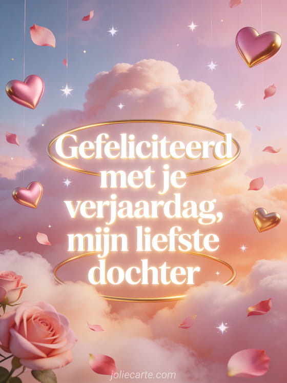Omhels je liefste dochter met deze hemelse kaart op haar verjaardag. Rose gouden hartjes drijven in een roze en perzikkleurige hemel met zachte witte wolken, glinsterende sterren en een regen van rozenblaadjes. Ontdek ook een verjaardagsbericht voor mijn dochter of een verjaardagsbericht dochter.