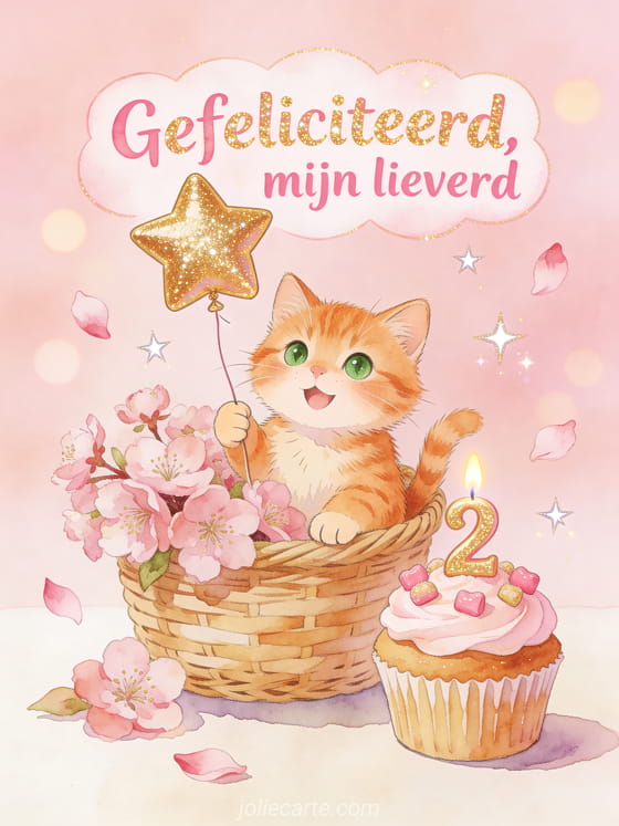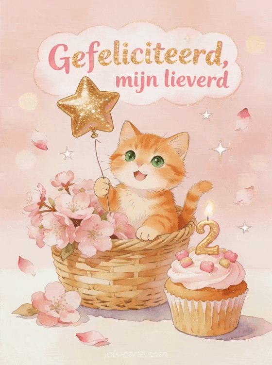 Stuur een tedere verjaardagsgroet met een schattig rood katje dat een gouden sterballon vasthoudt en in een mand met roze sakura bloemen zit. Een kleine roze cupcake, bloemblaadjes en fonkelende sterren maken een delicate feestelijke scene. Ontdek ook romantische verjaardag, gefeliciteerd mijn lief gif of gefeliciteerd mijn lief man geanimeerde gif.
