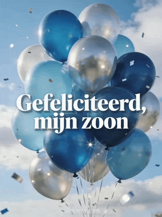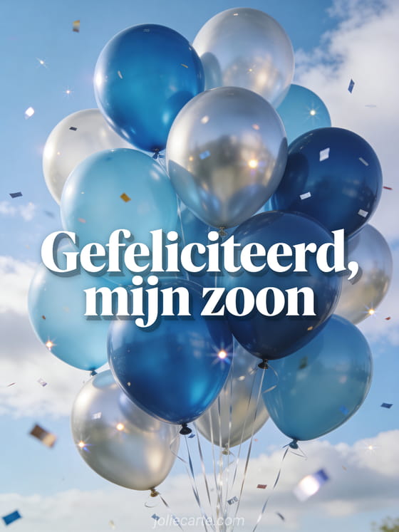 Vier je zoon met een fotorealistische verjaardagskaart met blauwe en zilveren ballonnen die in een heldere hemel zweven, fonkelende confetti en zachte wolken. Bekijk ook een grappige verjaardagswens voor mijn zoon, een verjaardagstekst voor mijn zoon of een fijne verjaardag mijn zoon citaat.
