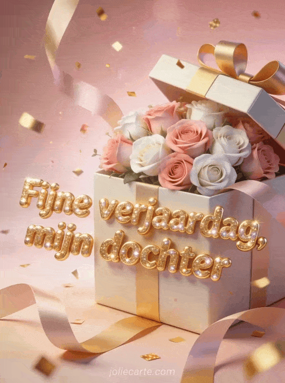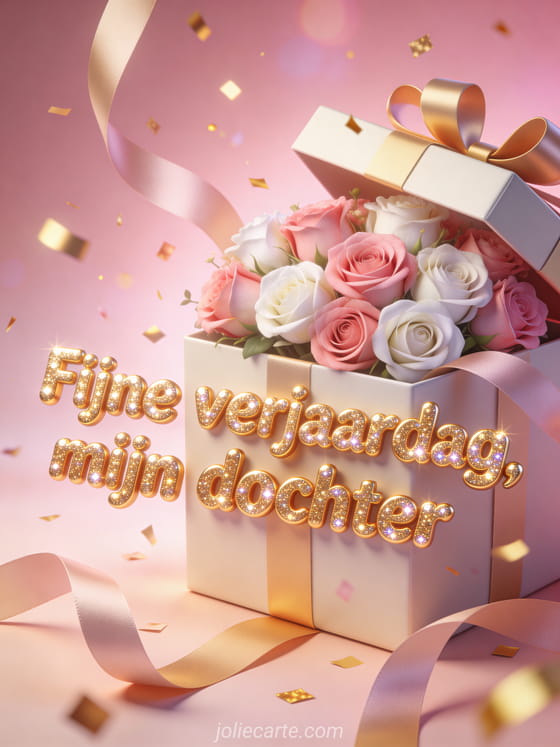 Verrast je dochter met dit prachtige cadeau op haar verjaardag. Een open cadeaudoos vol verse roze en witte bloemen met satijnen linten en gouden confettis die opvliegen op een licht roze poeder achtergrond. Ontdek ook een grappige tekst verjaardag voor je volwassen dochter of een verjaardagskaart voor mijn volwassen dochter.
