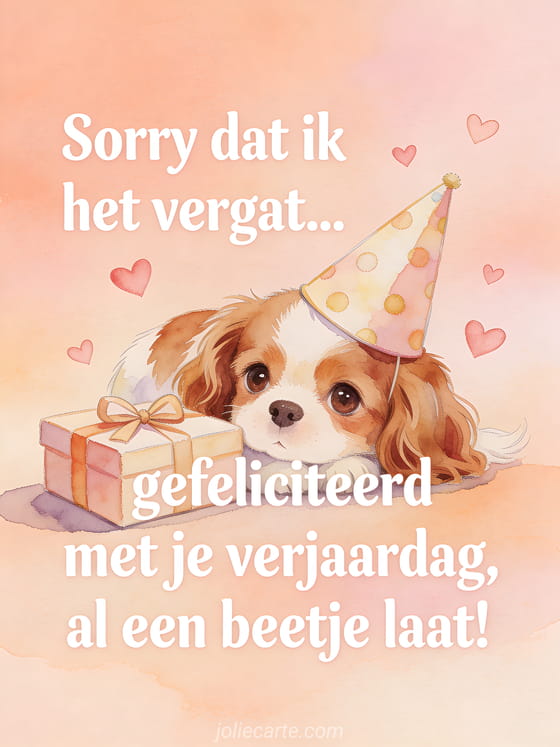 Een tedere aquarelkaart met een schattige Cavalier King Charles spaniel met scheefstaande feestmuts naast een cadeautje. Bekijk ook sms gefeliciteerd te laat of tekst gefeliciteerd te laat verjaardag.