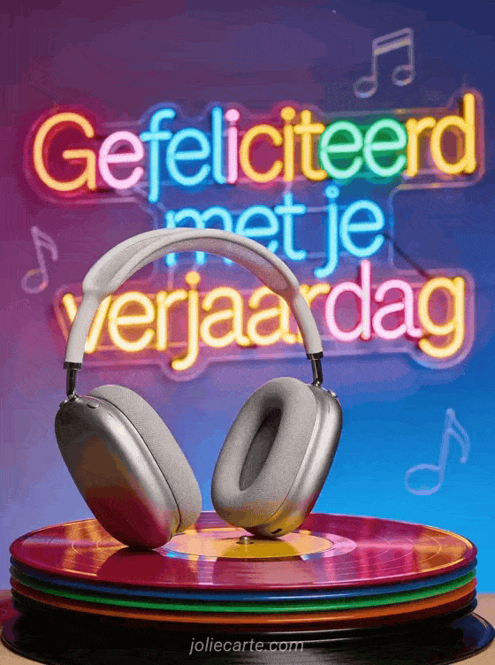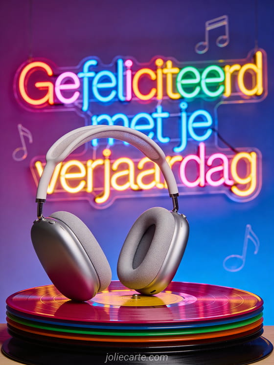 Een verjaardagskaart voor tieners die van muziek houden. Een stijlvolle koptelefoon op een stapel kleurrijke vinyl platen op een paars naar blauw verlopende achtergrond met drijvende muzieknoten in LED enseigne stijl. Ontdek ook een verjaardagskaart jong meisje of een gratis verjaardagskaart tiener jongen.