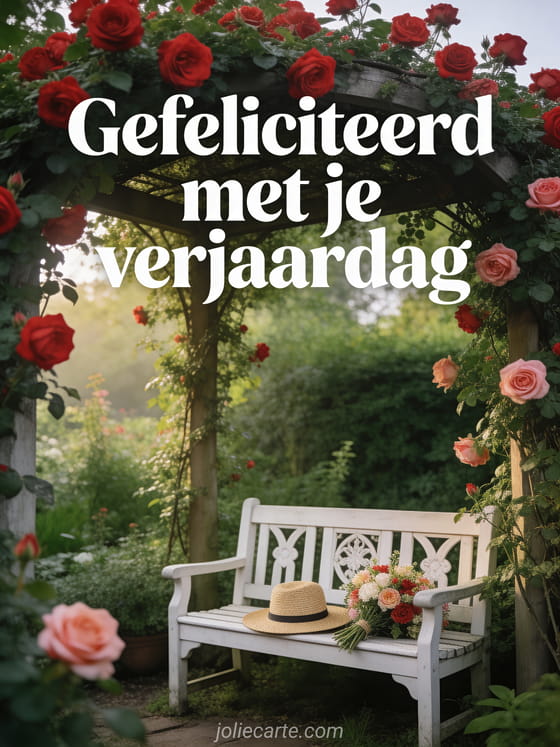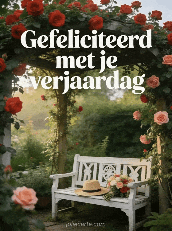 Stuur een romantische verjaardagsgroet met een prieel vol rode en roze klimrozen in een Engelse tuin. Een witte bank met strooien hoed en bloemenboeket in het zachte ochtendlicht. Bekijk ook gif gefeliciteerd verjaardag vuurwerk geanimeerd of verjaardagskaart prinses geanimeerd.