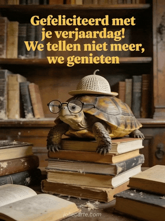 Stuur een grappige verjaardagsgroet en vier het leven met humor. Een geleerde schildpad met bril en bolhoed weet het zeker: we tellen niet meer, we genieten! Bekijk ook vrouw grappig gif verjaardag of gif humor geanimeerd grappig gefeliciteerd verjaardag.