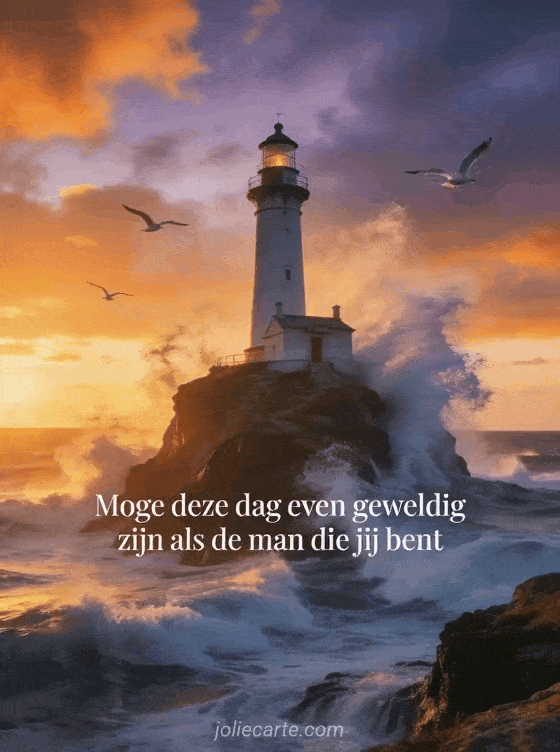 Een majestueuze vuurtoren op een rotsachtig klif bij zonsondergang met dramatische oranje en paarse tinten en vliegende meeuwen. Bekijk ook verjaardag man humor gratis of afbeeldingen gefeliciteerd verjaardag man humor.