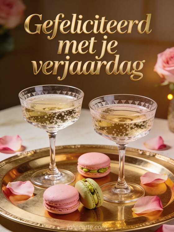 Twee kristallen champagneglazen met poederroze en pistachemacarons op een gouden dienblad met rozenblaadjes bij gedempte chique verlichting. Bekijk ook afbeelding van harte gefeliciteerd vrouw of gif van harte gefeliciteerd vrouw.