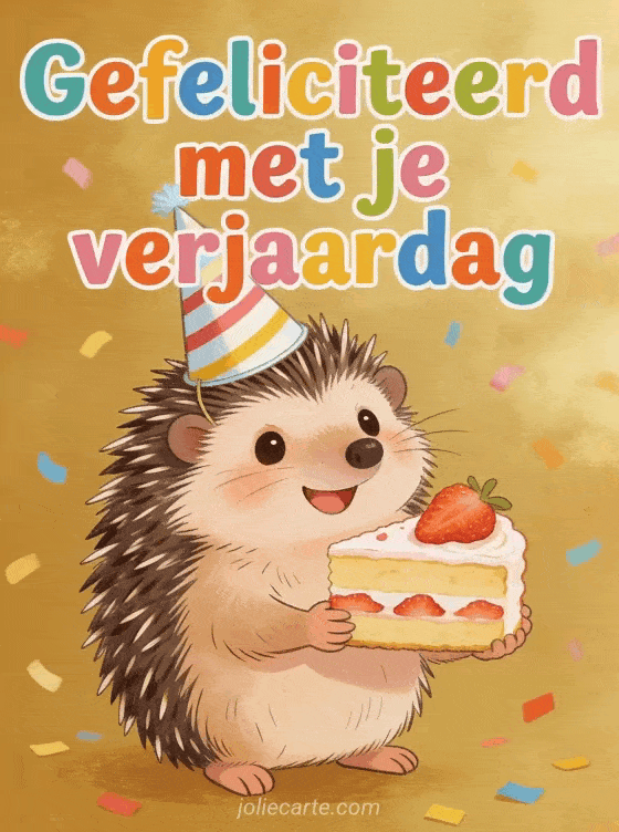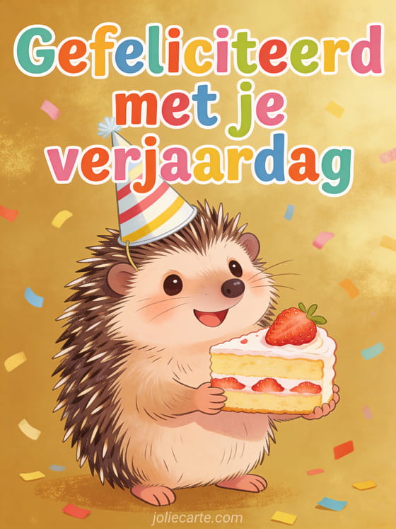 Een schattige egel met gestreepte feestmuts houdt een stukje aardbeientaart vast met een blij gezicht op een gouden achtergrond met confetti. Bekijk ook kaart gefeliciteerd verjaardag vrouw of citaat verjaardag vrouw.