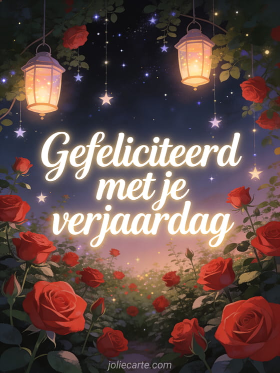 Verras een vrouw met deze prachtige verjaardagskaart met een betoverde tuin vol rode rozen en hangende lantaarns. Ontdek ook een gelukkige verjaardag mooie dame of een verjaardagskaart vrouw grappig.