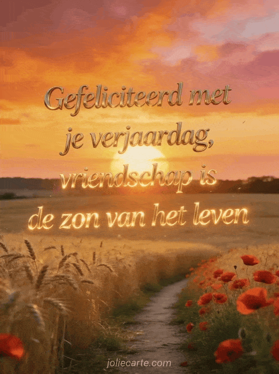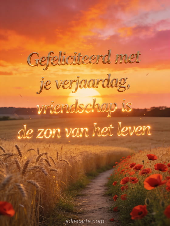 Een prachtige zonsondergang over een gouden tarweveld met rode klaprozen, voor een warme en serene verjaardagswens. Bekijk ook bericht verjaardag beste vriendin of verjaardag wens vriendin.