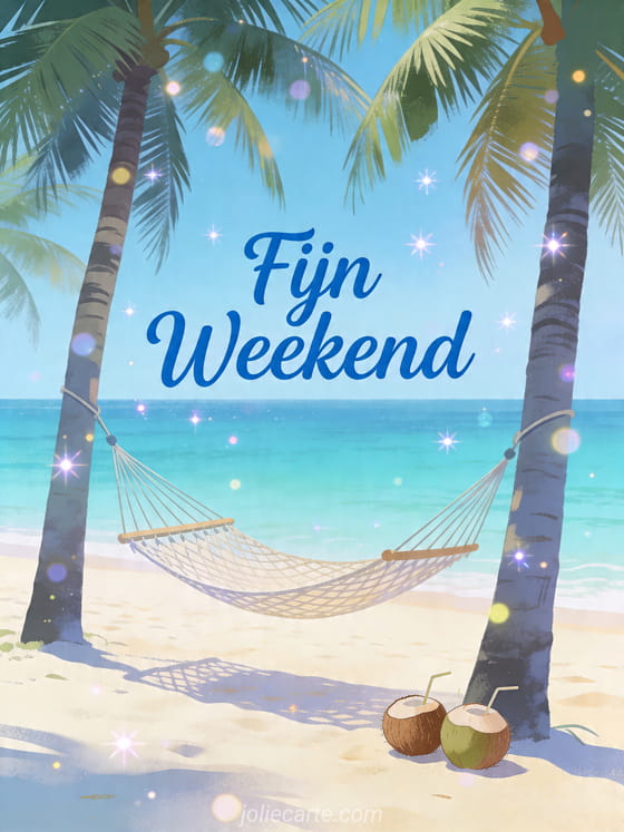 Deel een sereen Fijn weekend met deze gratis kaart waarop een hangmat tussen palmbomen staat op een turquoise strand met kokosdrankjes in het zand. Ontdek ook fijne zaterdag geanimeerde sprankelende gif, fijne zaterdag fijne dag of fijne zaterdag mooie afbeeldingen fijn weekend.