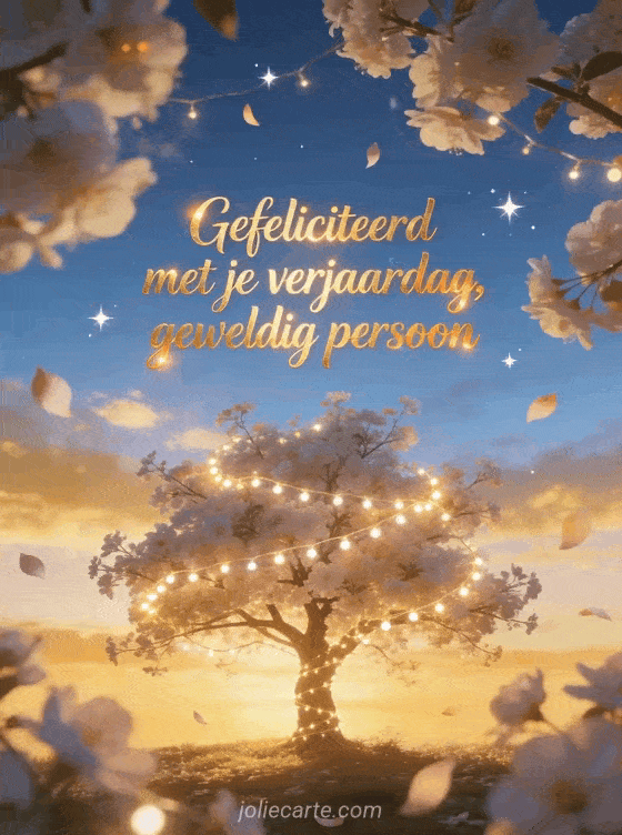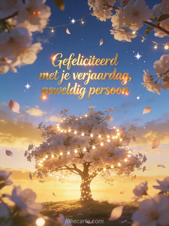 Stuur een warme gratis verjaardagskaart voor een geweldig persoon met een betoverde bloeiende boom vol lichtjes bij zonsondergang. Ontdek ook gelukkige verjaardag glitter, gelukkige verjaardag mimosabloesem boeket of manieren om een gelukkige verjaardag te wensen.
