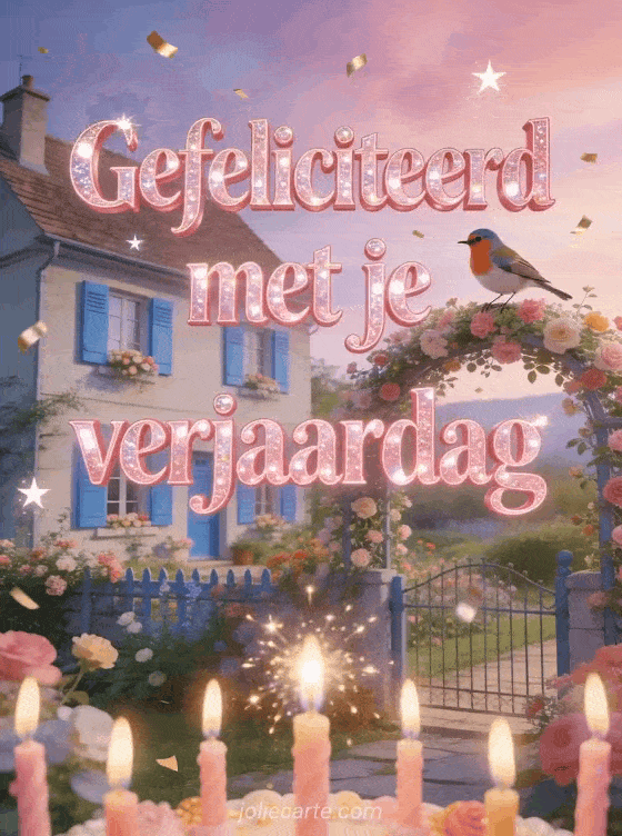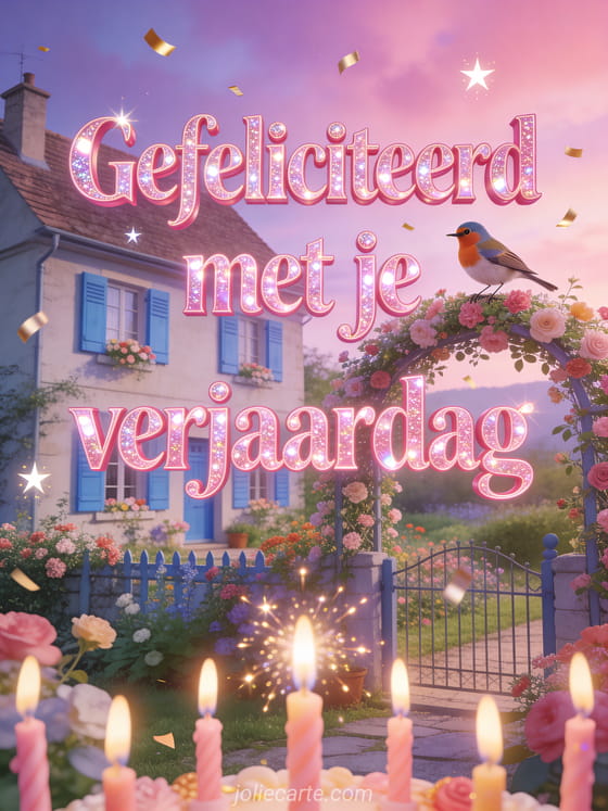 Stuur een sprankelende gratis girly verjaardagskaart met een landhuisje met blauwe luiken en een bloementuin onder een roze hemel. Ontdek ook verjaardagswens, gelukkige verjaardag wensen of gelukkige verjaardag oppas.
