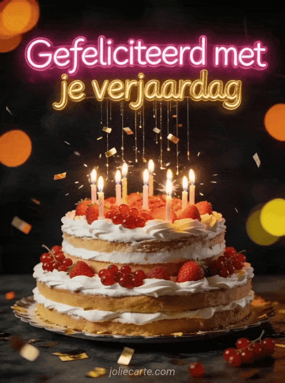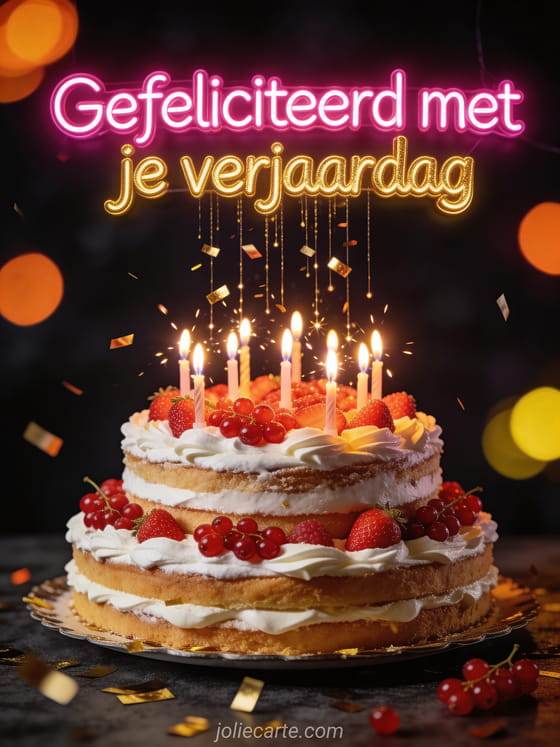 Stuur een feestelijke gratis verjaardagskaart met een drielaagse taart vol brandende kaarsen en gouden confetti. Ontdek ook gelukkige verjaardag zen of gelukkige verjaardag afbeelding.