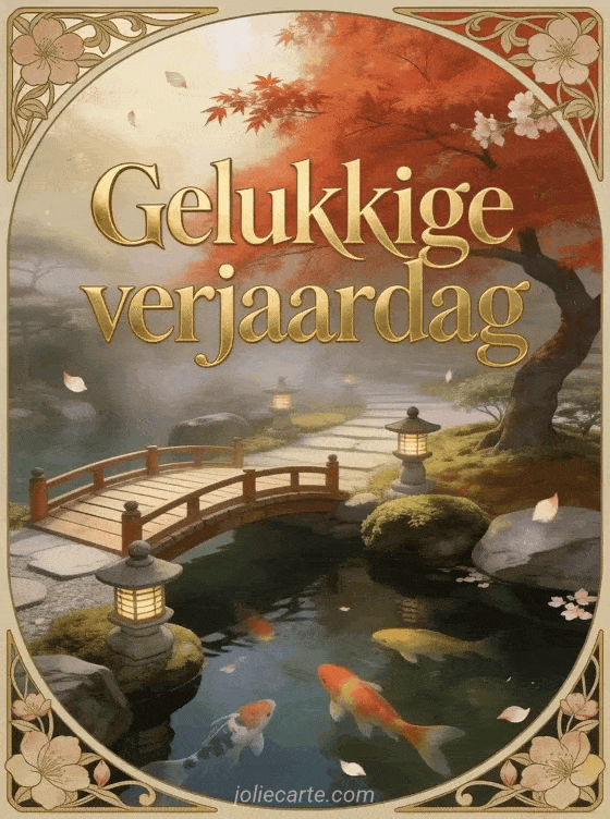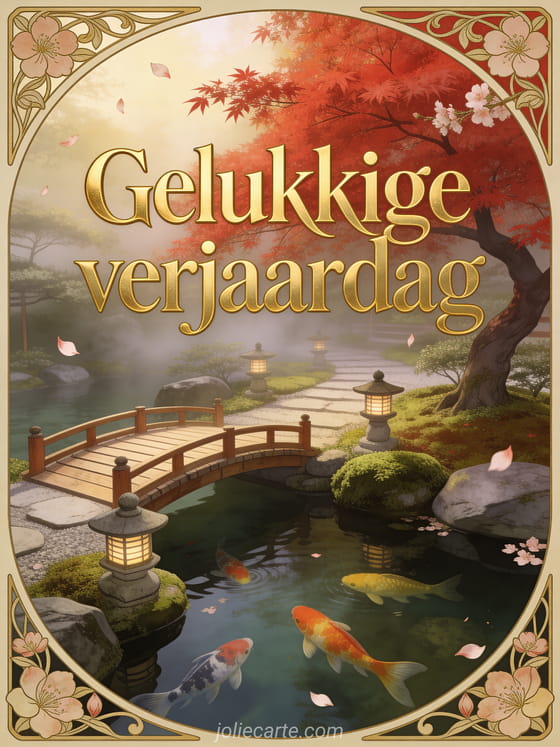 Een art nouveau Japanse zen tuin met een vuurrode esdoorn, houten brug over een vijver met koikarpers en stenen lantaarns in de ochtendmist. Bekijk ook citaat verjaardag man of gif verjaardag man gratis.