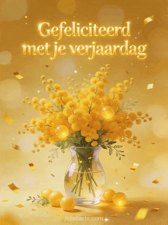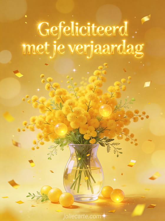 Stuur een stralende gratis verjaardagskaart met een prachtig geel mimosaboeket in een glazen vaas. Ontdek ook manieren om een gelukkige verjaardag te wensen, gelukkige verjaardag en fijne dag of gelukkige verjaardag verrassing wensen.