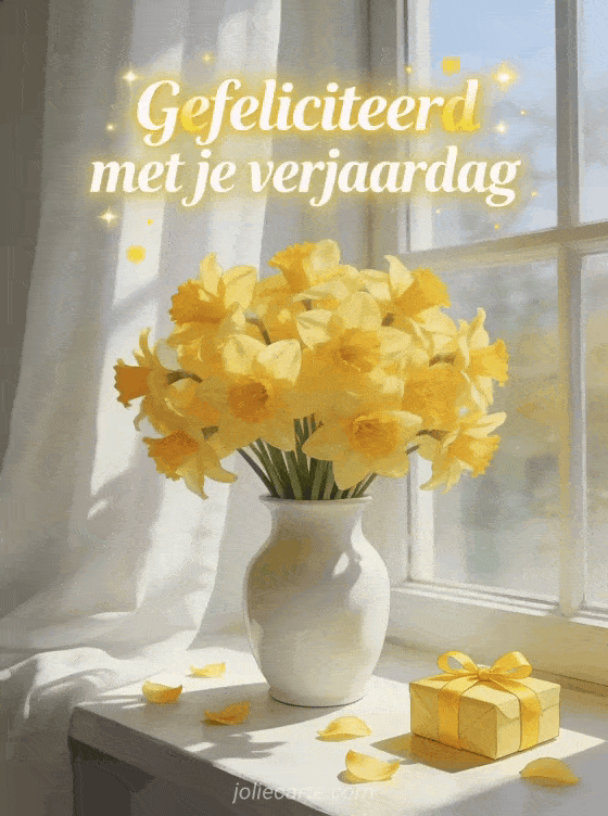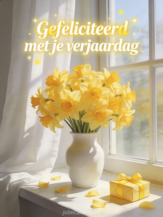 Stuur een lichte en vrolijke gratis verjaardagskaart met narcissen in een wit keramisch vaasje op een zonnig vensterbank. Ontdek ook vieren gelukkige verjaardag, gelukkige verjaardag met zonnebloemen of afbeelding kat gelukkige verjaardag.
