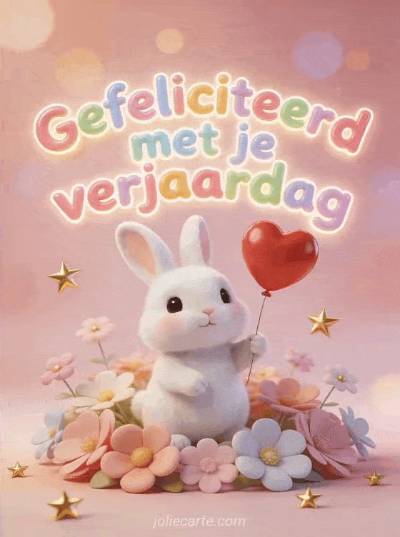 Stuur een schattige gratis gif verjaardagskaart met een wit konijntje dat een hartvormige ballon vasthoudt omgeven door pastelkleurige bloemen. Ontdek ook afbeelding gelukkige verjaardag vogel, gratis gif gelukkige verjaardag of gelukkige verjaardag lieve.