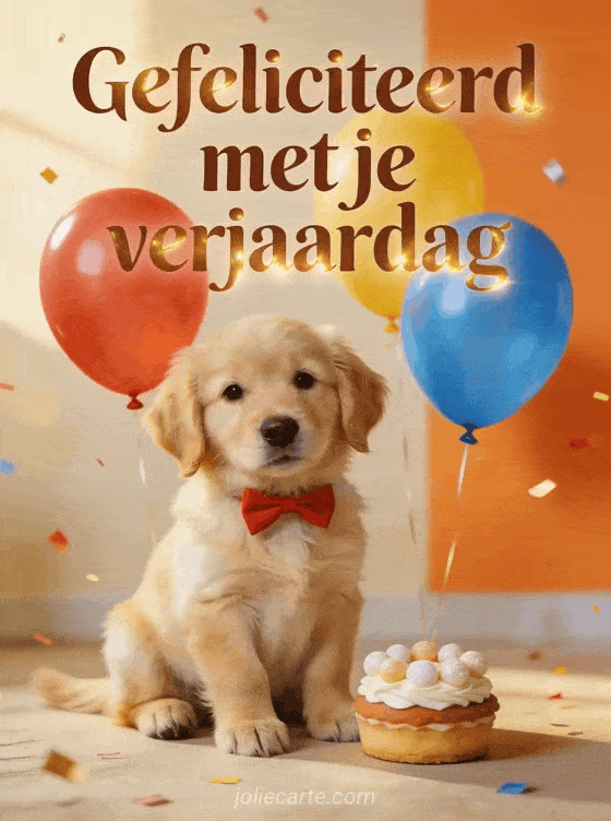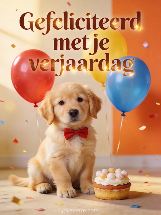 Stuur een schattige gratis verjaardagskaart met een golden retriever pup met een rode vlinderdas naast kleurrijke ballonnen en een taartje. Ontdek ook we wensen hem een gelukkige verjaardag, gelukkige verjaardag schattig gif of afbeelding gelukkige verjaardag vogel.
