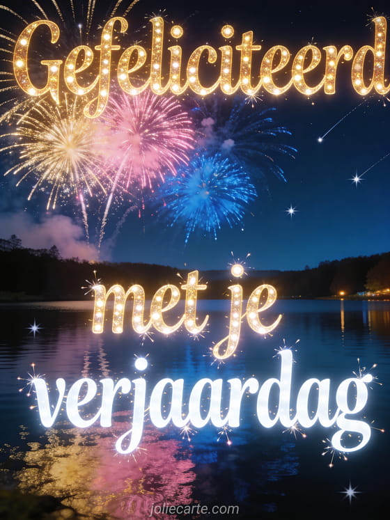 Stuur een spectaculaire gratis verjaardagskaart met kleurrijk vuurwerk dat weerspiegelt op een rustig meer. Ontdek ook gelukkige verjaardag kaars, gelukkige verjaardag zen of gelukkige verjaardag afbeelding.