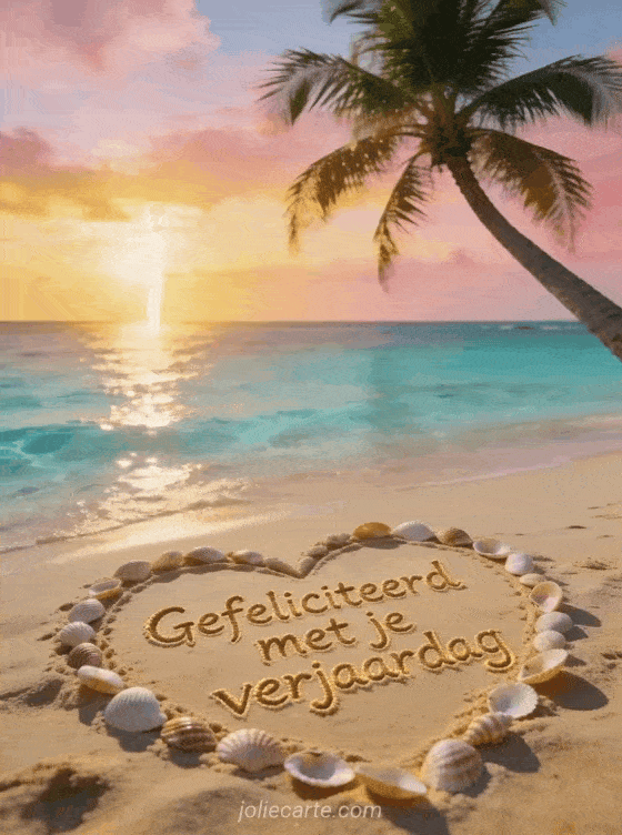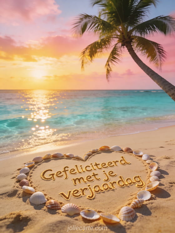 Stuur een vakantiesfeer verjaardagskaart met een felicitatie geschreven in goudkleurig zand met schelpen op een paradijselijk strand. Ontdek ook gelukkige verjaardag tederheid, gelukkige verjaardag vuurwerk of gelukkige verjaardag kaars.