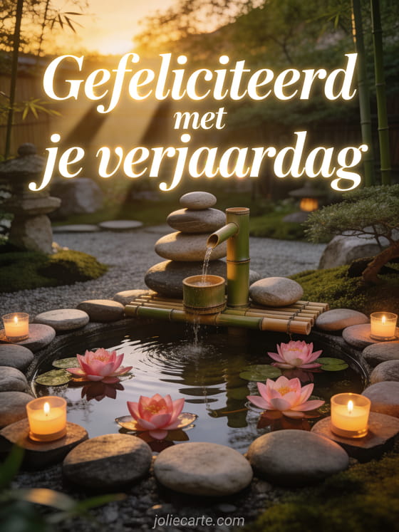 Stuur een rustgevende gratis verjaardagskaart met een Japanse zentuin vol lotussen en bamboe fontein. Ontdek ook een gelukkige verjaardag afbeelding.