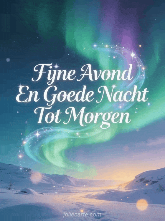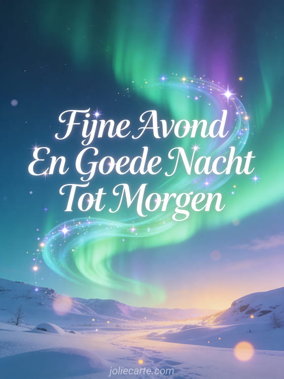 Stuur een magische goedenavondgroet met betoverende noorderlichten boven een besneeuwd landschap. Bekijk ook een fijne avond en goede nacht tot morgen kusjes of een afbeeldingen fijne avond tot morgen.