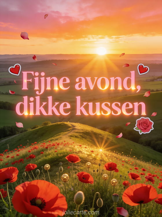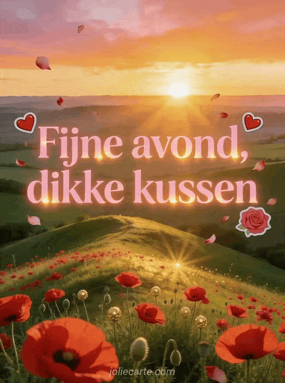 Stuur een romantische fijne avond kussen gif met klaprozen op een heuvel met een groene vallei in het avondlicht. Ontdek ook een gif animatie fijne avond kaart of een fijne avond met dieren kaart.