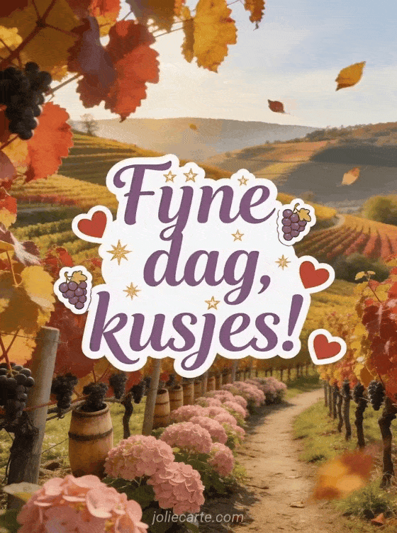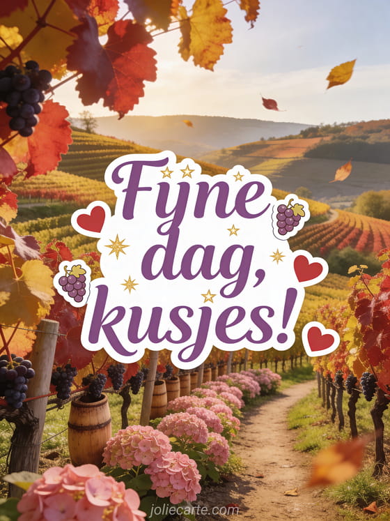 Verras iemand met deze warme herfstfijne dag kaart met een glooiende wijngaard en weelderige roze hortensia's. Ontdek ook een geanimeerde kaarten goedemorgen of fijne dag of een virtuele kaarten fijne dag goedemorgen.