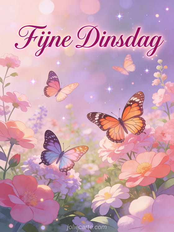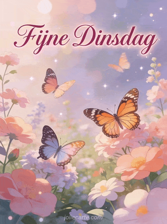 Stuur een gracieuse fijne dinsdag gif voor vrouwen via deze gratis wenskaart. Een prachtige vlindertuin met kleurrijke vlinders die dansen rondom bloeiende bloemen, een delicaat vrouwelijke sfeer met zachte roze en paarse tinten, gracieuze natuur scène. Bekijk ook een hele fijne dinsdag kusjes of een afbeelding van fijne dinsdag.
