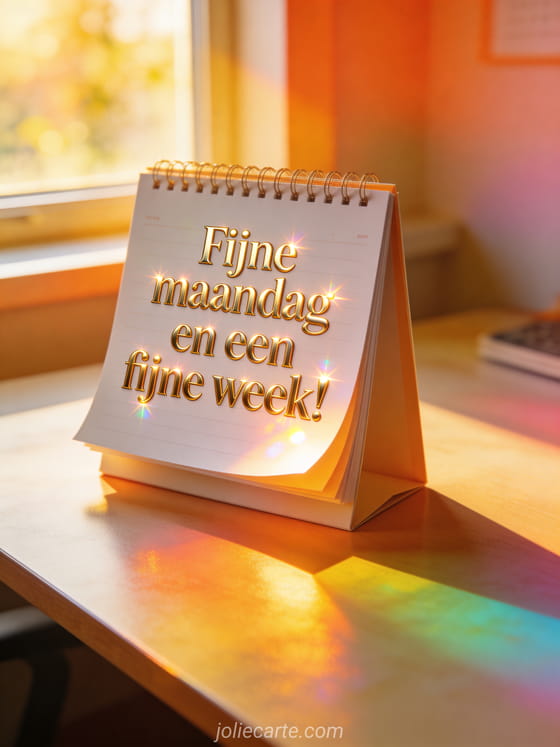 Deel fijne maandag en fijne week met verfijnde gouden typografie, een frisse kalender op een bureau bij een zonnig raam en kleurrijk ochtendlicht. Stuur ook fijne maandag geanimeerde afbeelding, gratis fijne maandag fijne week afbeelding of goedemorgen fijne maandag en fijne week kusjes.
