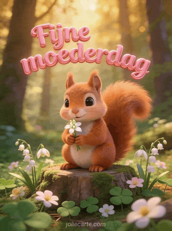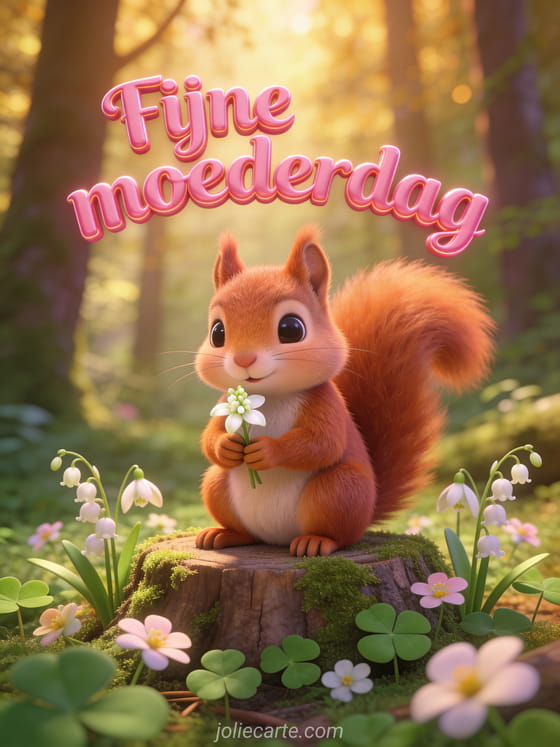 Verras mama met deze schattige moederdagkaart met een vrolijke eekhoorn die lelietje-van-dalen vasthoudt, omringd door madeliefjes. Bekijk ook vrolijke moederdag afbeeldingen of fijne moederdag voor alle moeders.