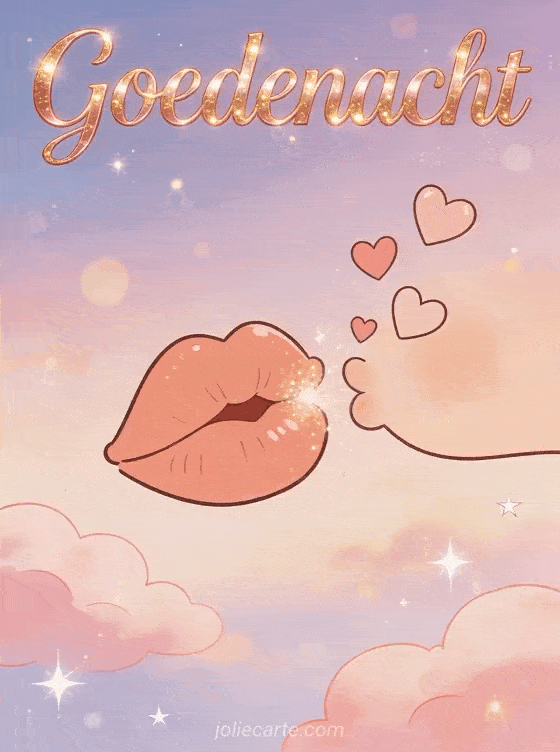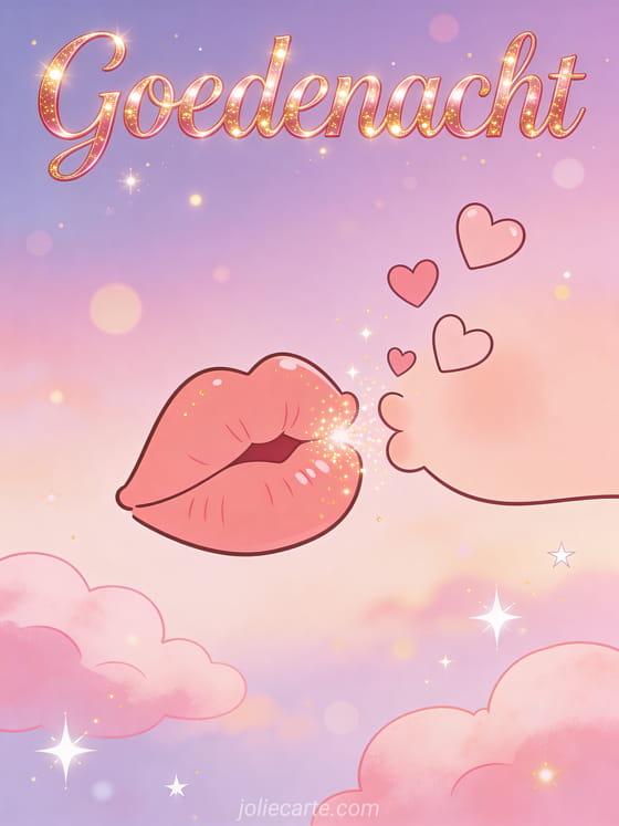 Stuur een romantische goedenavond en goedenacht kussen groet via deze gratis wenskaart. Een dromerig beeld met roze wolken, twinkelende sterren en vliegende hartjes, perfect voor een tedere nachtgroet.