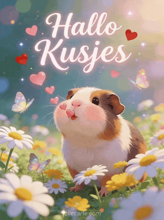 Gif hallo kusjes een lief geanimeerd hallo met een schattig cavia'tje dat kusjes blaast in een kleurrijke tuin