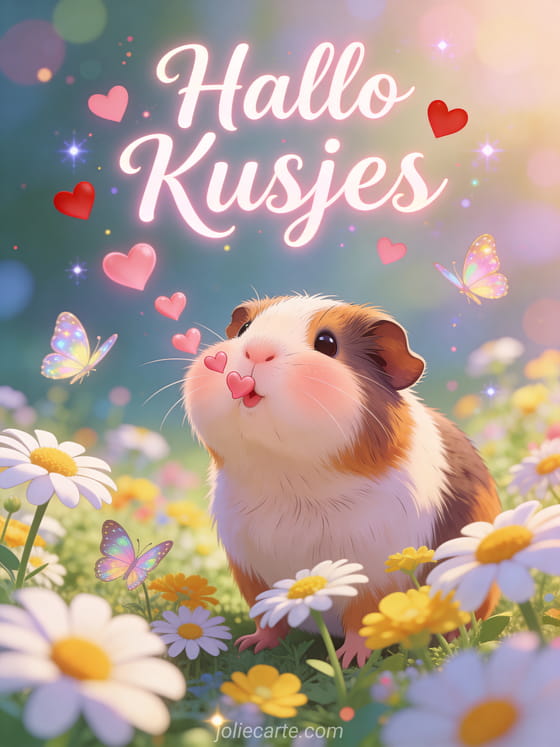 Deel een schattig geanimeerd begroeting met zwevende hartjes en een charmant cavia'tje tussen madeliefjes. Ontdek ook een hoi hallo gif kaart of een beer hoi kaart.