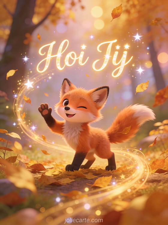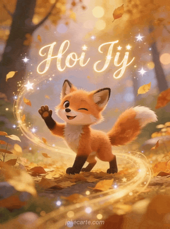 Stuur een geanimeerde persoonlijke begroeting met een speels vosje dat knipoogt en zwaait in een magisch herfstbos. Bekijk ook een kaart gratis buitenland of een hoi koffie.