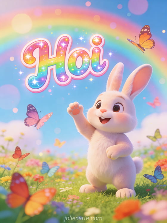 Stuur een vrolijke hoi gif met een schattig konijn zwaaiend met zijn poot in een kleurrijke lenteweide met dansende vlinders.