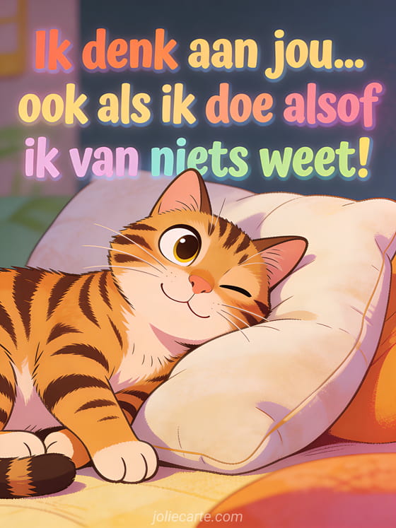 Stuur een grappige cartoon-kaart met een gestreepte kat die doet alsof hij slaapt met één wijd open oog en een schelms glimlach om iemand op een humoristische manier te laten weten dat je aan hem denkt. Bekijk ook een tekening ik denk aan jou, ik denk aan jou vriendin of gifs ik denk aan jou.