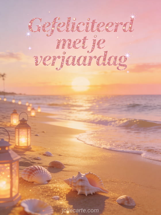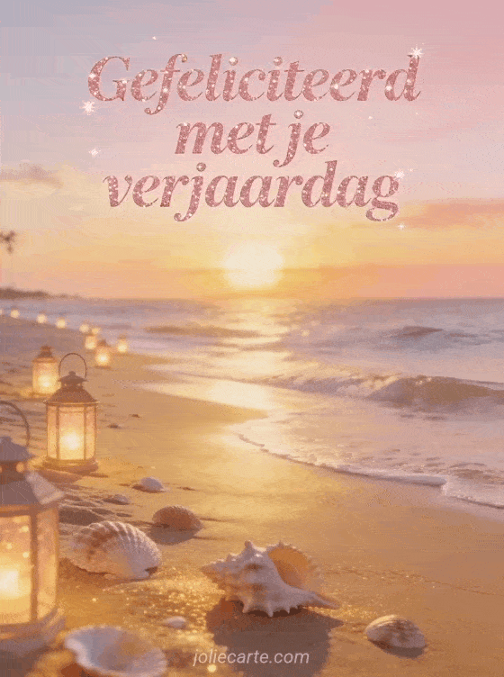 Stuur een romantische verjaardagsgroet met een prachtige zonsondergang aan zee, schelpen op het strand en aangestoken strandlantaarns. Een gouden sfeervolle kaart voor haar verjaardag. Bekijk ook vrouw geanimeerd gefeliciteerd verjaardag gif of gif geanimeerd gefeliciteerd verjaardag.