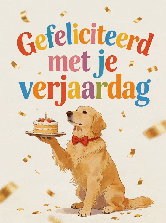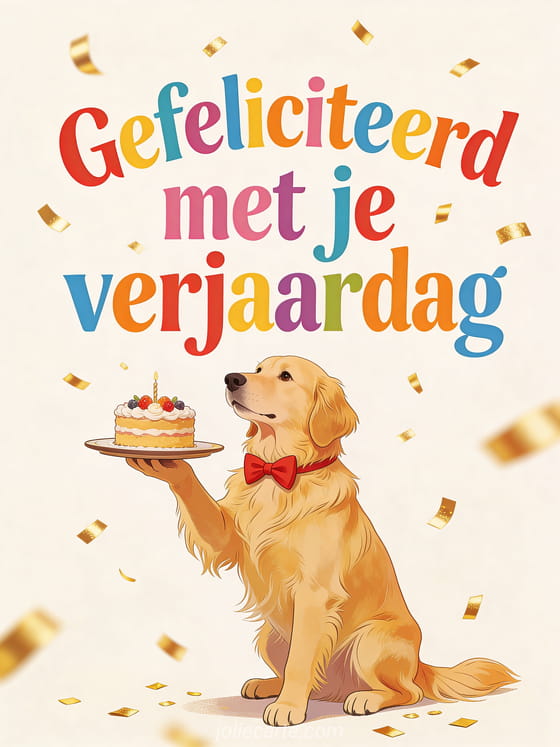 Een golden retriever met rode vlinderdas draagt trots een versierd taartje op een dienblad met gouden confetti. Bekijk ook verjaardag vrouw humor of tekst verjaardag vrouw.