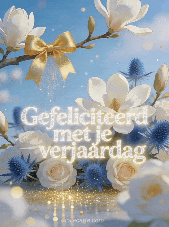 Verras een man met deze prachtige gif verjaardagskaart met witte en roze magnolia's en blauwe distels in de lente. Ontdek ook een mooie gratis verjaardagskaart man of een verjaardagskaart man tuinier.