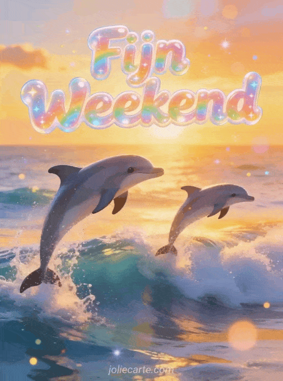 Maak iemands weekend vrolijker met deze geanimeerde kaart met dolfijnen bij zonsondergang. Ontdek ook een citaat om een fijn weekend te wensen of een een fijn weekend wensen met humor.
