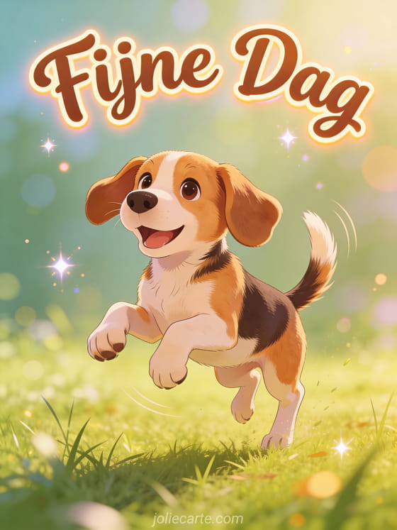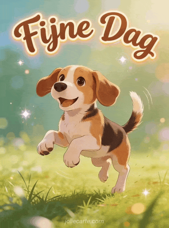 Stuur iemand een vrolijke dag boodschap met deze gratis honden wenskaart. Ontdek ook een gif fijne zonnige dag kaart of een hoi fijne dag kaart.