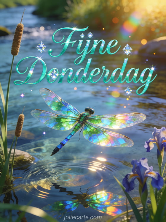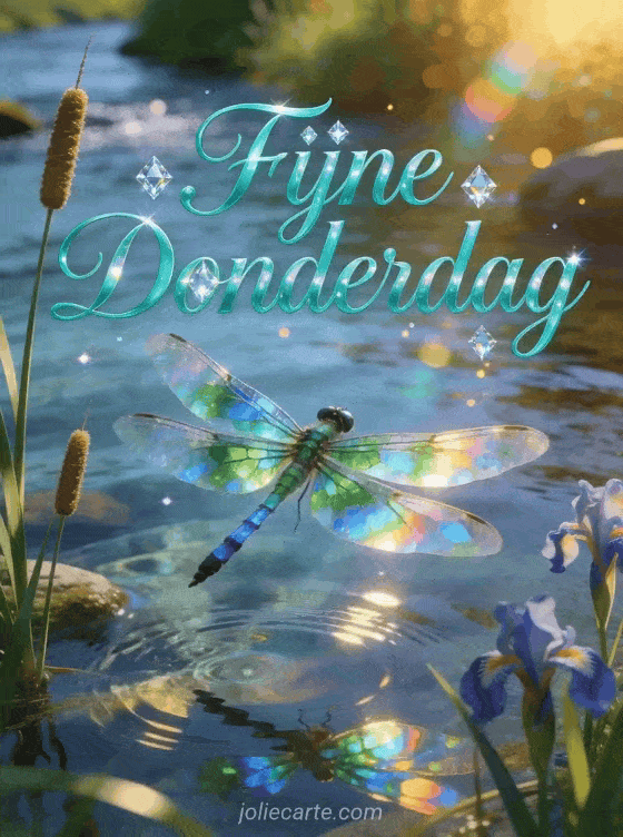Stuur een magische fijne glinsterende donderdag gif via deze gratis wenskaart. Een prachtige libel met doorzichtige vleugels die als glas-in-lood regenboogkleuren opvangen, zwevend boven een kristalhelder beekje, vleugels schitterend met smaragdgroen en saffierblauw reflecties op het wateroppervlak. Bekijk ook een goedemorgen regenachtige donderdag.