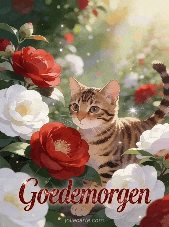 Stuur een verfijnde geanimeerde goedemorgengroet met een speelse Bengaalse kat tussen rode en witte camelia bloemen in een luxe ochtendtuin. Bekijk ook een hallo hoe gaat het of een tederheid ochtend goedemorgen.